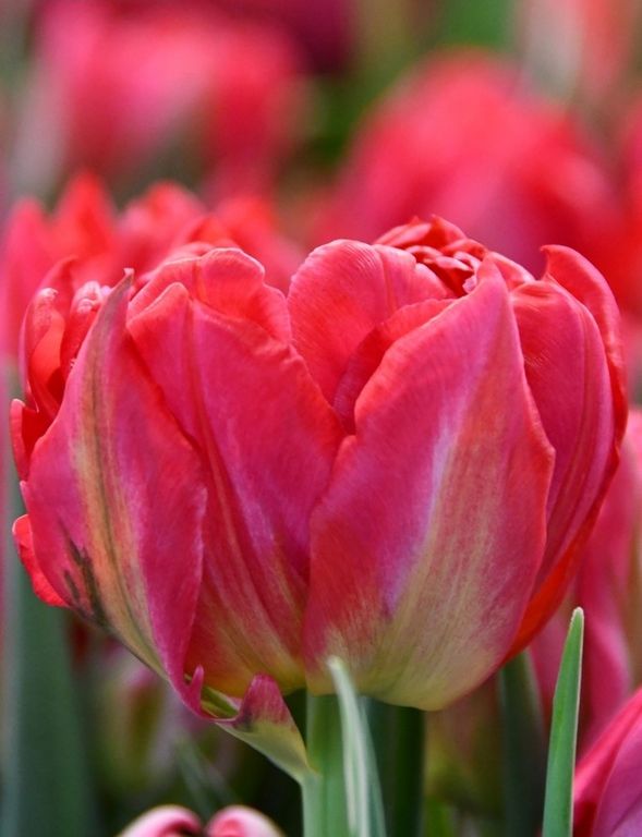 Отличается пионовидной формой цветка и красновато-розовым цветом с зеленоватой спинкой.