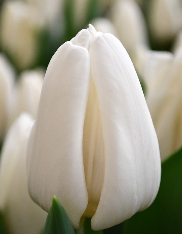 - Бутон — не слишком плотный, правильной бокаловидной формы, размером 6–7 см, белый с лёгким кремовым оттенком. Лепестки ровные, с округлой вершиной, слегка загнутыми внутрь краями.